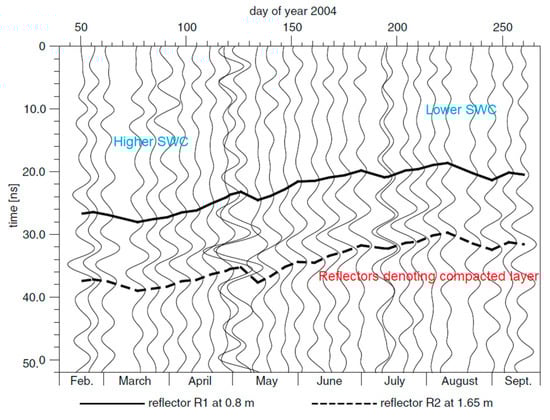 Wollschläger and Roth [147] investigated the temporal variations in SWC within compacted layers on farmland near Heidelberg, Germany, using GPR trace monitoring and analysis. The soil was classified as sandy loam with increasing clay content with depth, and long-term agricultural activity led to the formation of a plough pan in the subsoil. Continuous GPR measurements with a central frequency of 250 MHz conducted throughout 2004 successfully detected two distinct reflections attributed to the upper and lower boundaries of a compacted layer, located at 0.8 m and 1.65 m depth, respectively. The reflections showed variations in travel time due to seasonal fluctuations in SWC, but the time between the first and the second remained stable, indicating low SWC variability within the compacted layer (Figure 11). However, the authors acknowledged that SWC estimation might have been overestimated due to uncertainties in precise depth calibration related to the varying perched water table depth during the experiment.