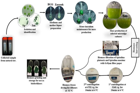 Figure 1. Integrative process of sample collection, isolation and identification, mass production, and biomass harvesting for biofertilizer production. Sp: Spirulina platensis; Sm: Spirulina maxima; Cv: Chlorella vulgaris.
