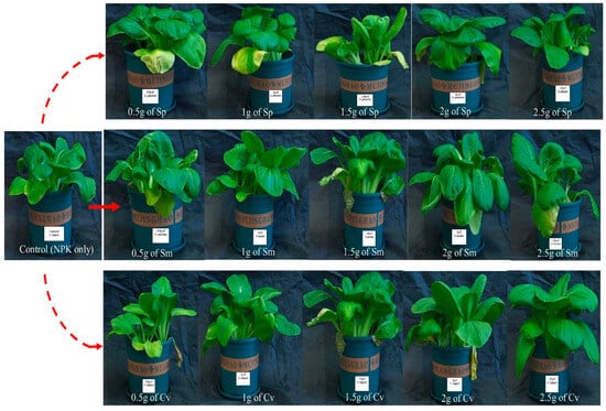 Figure 2. Visualization of the effects of microalgae Spirulina platensis, Spirulina maxima, and Chlorella vulgaris on Pak Choi growth and development. Sp: Spirulina platensis; Sm: Spirulina maxima; and Cv: Chlorella vulgaris with their respective mentioned concentrations.