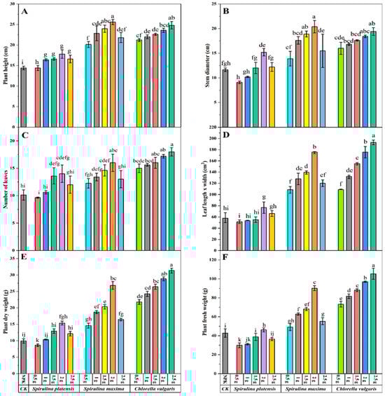 Figure 3. Effect of microalgae biofertilizers on above-ground morphology of Pak Choi. (A) Plant height; (B) stem diameter; (C) number of leaves; (D) leaf length x width; (E) plant fresh weight; and (F) plant dry weight. A significant difference was calculated using one-way ANOVA according to the Tuckey HSD method at a p < 0.05 level of probability. Means with the same letter in each column do not differ significantly, and the mean of each parameter was obtained from five biological replications.