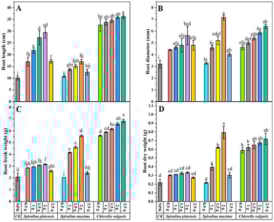 Figure 4. Effect of microalgae biofertilizers on below-ground morphology of Pak Choi. (A) Root length; (B) root diameter; (C) root fresh weight; and (D) root dry weight. A significant difference was calculated using one-way ANOVA according to the Tuckey HSD method at a p < 0.05 level of probability. Means with the same letter in each column do not differ significantly, and the mean of each parameter was obtained from five biological replications.