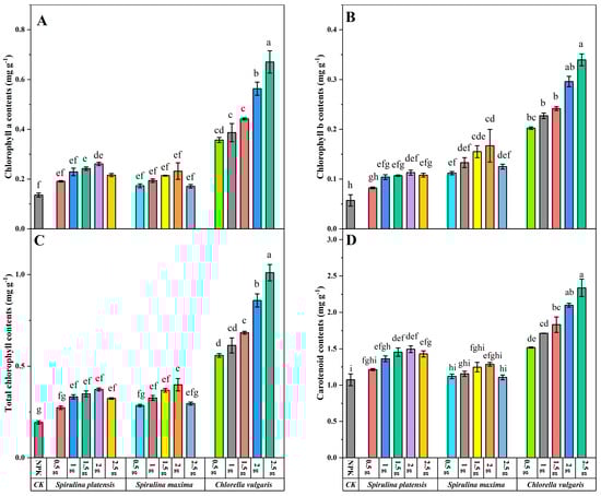 Figure 5. Effect of microalgae biofertilizers on chlorophyll a, b total and carotenoid contents of Pak Choi. (A) Chlorophyll a; (B) chlorophyll b; (C) total chlorophyll; and (D) carotenoid contents. A significant difference was calculated using one-way ANOVA according to the Tuckey HSD method at a p < 0.05 level of probability. Means with the same letter in each column do not differ significantly, and the mean of each parameter was obtained from five biological replications.