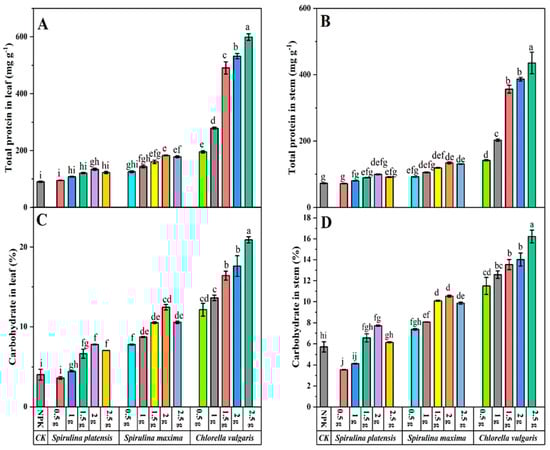 Figure 6. Effect of microalgae biofertilizers on total protein and carbohydrate contents of Pak Choi tissues. (A) Total protein in the leaf; (B) total protein in the stem; (C) carbohydrate in the leaf; and (D) carbohydrate in the stem. A significant difference was calculated using one-way ANOVA according to the Tuckey HSD method at a p < 0.05 level of probability. Means with the same letter in each column do not differ significantly, and the mean of each parameter was obtained from five biological replications.