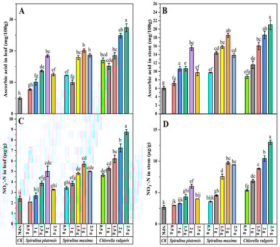 Figure 7. Effect of microalgae biofertilizers on ascorbic acid and nitrate nitrogen contents of different Pak Choi tissues. (A) Ascorbic acid in the leaf; (B) ascorbic acid in the stem; (C) nitrate-nitrogen in the leaf; (D) nitrate-nitrogen in the stem. A significant difference was calculated using one-way ANOVA according to the Tuckey HSD method at a p < 0.05 level of probability. Means with the same letter in each column do not differ significantly, and the mean of each parameter was obtained from five biological replications.