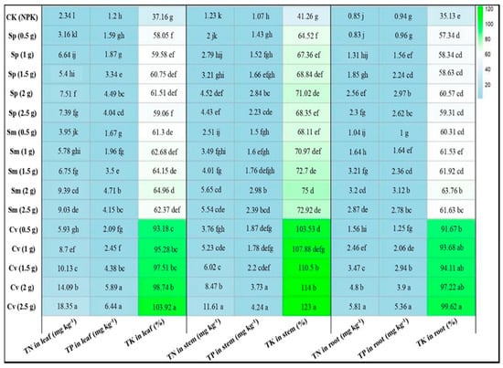 Figure 8. Nutritional heat map of different Pak Choi tissues after microalgae biofertilizer application. sp: Spirulina platensis; Sm: Spirulina maxima; Cv: Chlorella vulgaris; TN: total nitrogen; TP: total phosphorus; TK: total potassium. A significant difference was calculated using one-way ANOVA according to the Tuckey HSD method at a p < 0.05 level of probability. Means with the same letter in each column do not differ significantly, and the mean of each parameter was obtained from five biological replications.