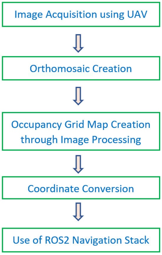 The natural outdoor agricultural environment is diverse, and the crop field environment is no exception. Moreover, the agricultural field environment is more complex than a conventional city or urban environment. Row planting is a widespread practice in farming systems. Precision agriculture has flourished in row plantation in recent years, maximizing crop production and cost-effectiveness by using different sensors, Geographic Information Systems (GISs), and Global Navigation Satellite Systems (GNSSs) [4,5,6]. While large over-canopy agricultural machinery can easily use an RTK-GPS (Real-Time Kinematic Global Positioning System) for autonomous navigation, under-canopy robot navigation presents significant challenges because it cannot rely on an RTK-GPS [7]. Leveraging RGB imagery for this task has proven complex due to substantial visual variability across different times of the day and growing seasons, which undermines the reliability of heuristic-based crop row detection [8]. Additionally, the visual homogeneity of the environment often leads to positional drift in SLAM-based approaches [9]. The field environment of row crops such as corn, soybeans, wheat, or sorghum is complex for autonomous robots traveling through rows. Finding the optimum route is challenging, including non-deterministic polynomial time (NP-hard) problems, among others [10]. Hence, aerial map creation for a particular crop field before any robotic operations would help in assessing the field conditions and optimizing operations in accordance with the capability of ground robots before starting the operation carried out by ground robots.