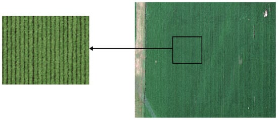 Orthomosaic image of soybean field and zoomed-in view of crop rows.