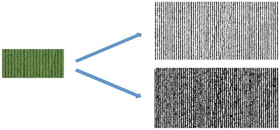 The thresholding operations, which are a kind of image segmentation method, show promising results for soybean, where the crop rows are visibly well defined with no significant overlaps, as shown in Figure 5. However, in the case of corn, where leaves overlapped most of the rows, segmentation failed to efficiently differentiate the rows (see Figure 6), unlike for soybeans. The two figures also show that global thresholding yielded a better result than using an adaptive threshold in soybeans, whereas using an adaptive threshold showed a slightly better result than that using a global threshold in corn. After segmentation, morphological operations (dilation, erosion, opening, and closing) with different structuring elements (disc, diamond, and square) were applied, but the processes did not significantly improve the segmentation results and are not worth mentioning.