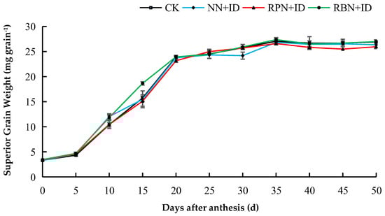 Effect of N reduction and density increase on changes in superior grain weight in 2023. Data are averages of replicates of the same treatment, and the vertical bars represent the standard error. CK: normal nitrogen and normal density, NN+ID: normal nitrogen and increased density, RPN+ID: reduced nitrogen in panicle fertiliser and increased density, and RBN+ID: reduced nitrogen in basal fertiliser and increased density.
