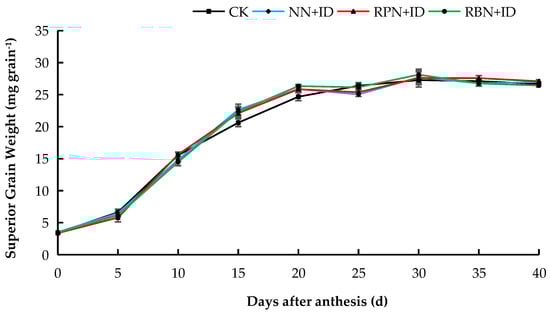Effect of N reduction and density increase on changes in superior grain weight in 2024. Data are averages of replicates of the same treatment, and the vertical bars represent the standard error. CK: normal nitrogen and normal density, NN+ID: normal nitrogen and increased density, RPN+ID: reduced nitrogen in panicle fertiliser and increased density, and RBN+ID: reduced nitrogen in basal fertiliser and increased density.