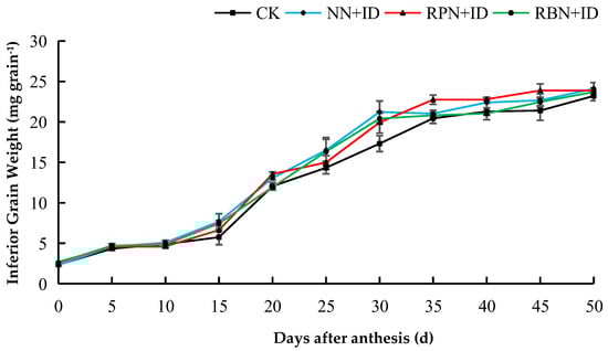 Effect of N reduction and density increase on changes in inferior grain weight in 2023. Data are averages of replicates of the same treatment, and the vertical bars represent the standard error. CK: normal nitrogen and normal density, NN+ID: normal nitrogen and increased density, RPN+ID: reduced nitrogen in panicle fertiliser and increased density, and RBN+ID: reduced nitrogen in basal fertiliser and increased density.