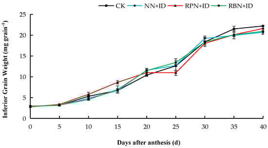 Effect of N reduction and density increase on changes in inferior grain weight in 2024. Data are averages of replicates of the same treatment, and the vertical bars represent the standard error. CK: normal nitrogen and normal density, NN+ID: normal nitrogen and increased density, RPN+ID: reduced nitrogen in panicle fertiliser and increased density, and RBN+ID: reduced nitrogen in basal fertiliser and increased density.