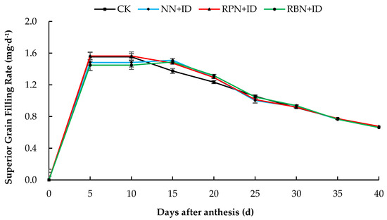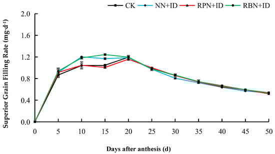 Effect of N reduction and density increase on filling rate of superior grains in 2023. Data are averages of replicates of the same treatment, and the vertical bars represent the standard error. CK: normal nitrogen and normal density, NN+ID: normal nitrogen and increased density, RPN+ID: reduced nitrogen in panicle fertiliser and increased density, and RBN+ID: reduced nitrogen in basal fertiliser and increased density.