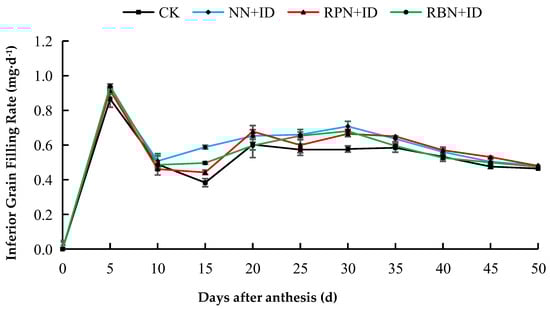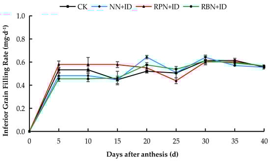 Effect of N reduction and density increase on filling rate of inferior grains in 2024. Data are averages of replicates of the same treatment, and the vertical bars represent the standard error. CK: normal nitrogen and normal density, NN+ID: normal nitrogen and increased density, RPN+ID: reduced nitrogen in panicle fertiliser and increased density, and RBN+ID: reduced nitrogen in basal fertiliser and increased density.
