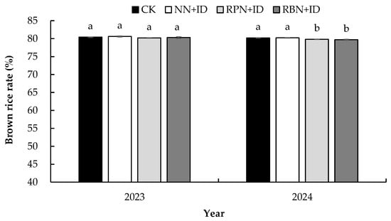 Effect of nitrogen reduction and density increase on brown rice rate. Data are averages of replicates of the same treatment, and the vertical bars represent the standard error (p < 0.05). Different lowercase letters in the columns indicate significant differences between treatments (p < 0.05). CK: normal nitrogen and normal density, NN+ID: normal nitrogen and increased density, RPN+ID: reduced nitrogen in panicle fertiliser and increased density, and RBN+ID: reduced nitrogen in basal fertiliser and increased density.