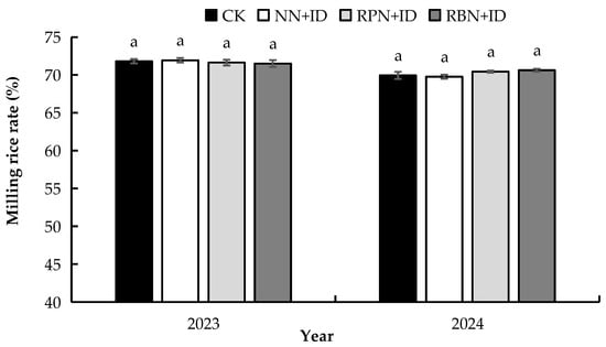 Effect of N reduction and density increase on milling rice rate. Data are averages of replicates of the same treatment, and the vertical bars represent the standard error (p < 0.05). Different lowercase letters in the columns indicate significant differences between treatments (p < 0.05). CK: normal nitrogen and normal density, NN+ID: normal nitrogen and increased density, RPN+ID: reduced nitrogen in panicle fertiliser and increased density, and RBN+ID: reduced nitrogen in basal fertiliser and increased density.