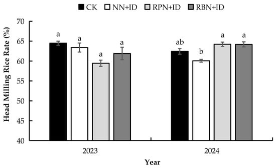 Effect of N reduction and density increase on head milling rice rate. Data are averages of replicates of the same treatment, and the vertical bars represent the standard error (p < 0.05). Different lowercase letters in the columns indicate significant differences between treatments (p < 0.05). CK: normal nitrogen and normal density, NN+ID: normal nitrogen and increased density, RPN+ID: reduced nitrogen in panicle fertiliser and increased density, and RBN+ID: reduced nitrogen in basal fertiliser and increased density.