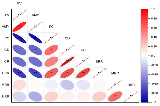 Heat map for correlation analysis * and ** represent statistical significance at p < 0.05 and p < 0.01. FV: flavour values, AMY: straight-chain amylose, PC: protein content, CD: chalkiness degree, CR: chalkiness rate, BRR: brown rice rate, MRR: milling rice rate, HRR: head milling rice rate.