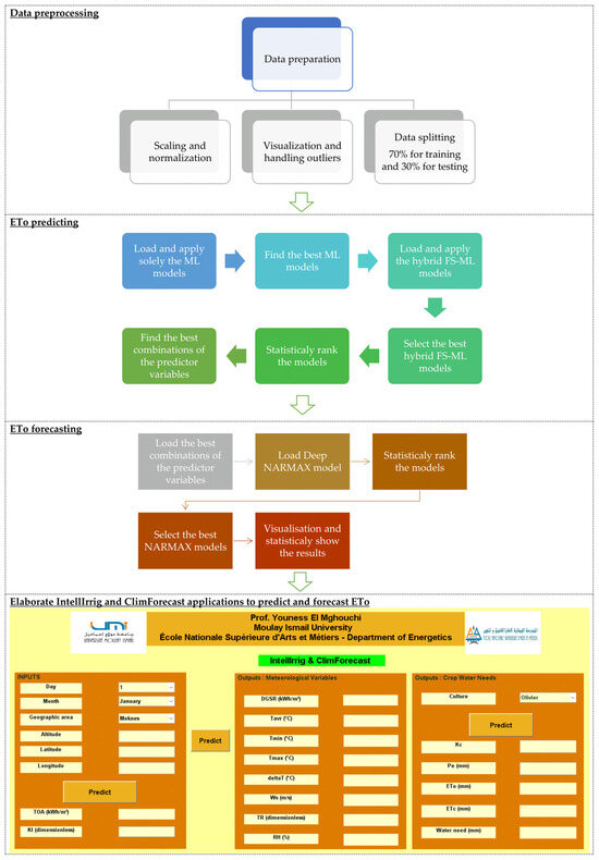 The proposed methodology for predicting and forecasting reference evapotranspiration (ETo) is outlined in the flowchart below (see Figure 2).