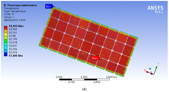 Based on ANSYS Fluent simulations, we analysed the temperature distribution of a specific PV module without a cooling-equipped network, considering two solar irradiance values: 800 W/m2 and 1000 W/m2 (see Figure 3). The results indicate that the temperature within the PV module ranged from 51.895 °C to 53.523 °C for insolation of 800 W/m2 and from 59.368 °C to 61.403 °C for insolation of 1000 W/m2. Notably, the PV panel was completely exposed to solar radiation in this simulation. These results show that high irradiance levels can significantly elevate the temperature of the PV panel, consequently reducing the efficiency of the PV system. Hence, we investigated the same PV panel under similar irradiances with two cooling options: scaled PVT and coiled PVT. Figure 4 demonstrates the temperature distribution for scaled PVT (a) at 800 W/m2 solar irradiance and (b) at 1000 W/m2 solar irradiance. As a result, the PV panel temperature could decrease by approximately 14 °C and 15 °C for 800 W/m2 and 1000 W/m2 solar irradiance, respectively. This significant reduction in temperature undoubtedly enhances the effectiveness of the PV system and increases the electricity produced for pumping and irrigation purposes.