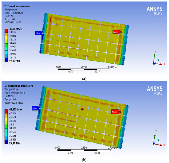 PV module temperature distribution without cooling systems under solar irradiance of 800 W/m2 (a) and 1000 W/m2 (b).