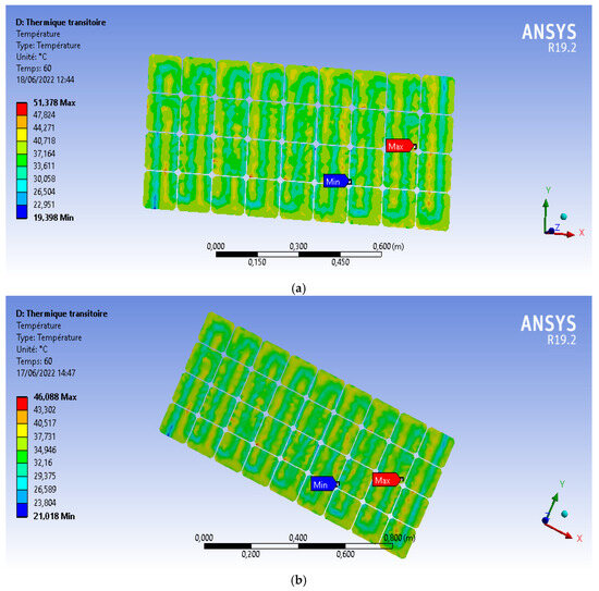 Figure 5 illustrates the temperature distribution for coiled PVT (a) at 800 W/m2 solar irradiance and (b) at 1000 W/m2 solar irradiance. In this scenario, the temperature within the PV panel varied between 19.398 °C and 51.378 °C for 800 W/m2 irradiance and between 21.018 °C and 46.088 °C for 1000 W/m2 irradiance. There was a reduction in temperature of approximately 2 °C and 15 °C for 800 W/m2 and 1000 W/m2, respectively. This indicates an enhancement in the PV efficiency of approximately 2.94% and 9.72% for both solar fluxes, as summarised in Table 4.