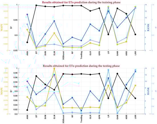 In this subsection, we conduct a comparative analysis of 13 different ML models for ETo prediction, emphasising their prediction accuracy and suitability for agricultural applications. The results of the comparison are depicted in Figure 7. Each studied ML model demonstrated unique strengths and weaknesses in ETo prediction. During the training stage, the decision tree (DT) emerged as the best-performing model, whereas during the testing stage, the tree bagger (TreeBag) model outperformed the others. The R2 values exceeded the level of confidence (R2 = 0.95) and approached one, indicating the highest level of accuracy prediction achieved by the best-performing models.