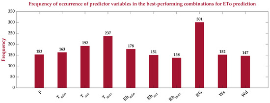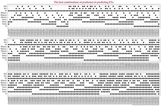 The results obtained are presented in Figure 8 and Figure 9. A total of 301 best combinations of meteorological variables for predicting ETo were identified. Solar irradiance (H) emerged as the most crucial variable in all identified best combinations. This underscores the indispensability of H as a predictor in ETo modelling and prediction. The second most important variable was Tmax, present in 237 identified combinations. None of the combinations yielded ETo predictions based on just one or two input variables. Further insights can be gleaned from the same figures.