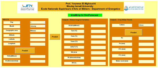 This research focuses on developing an intelligent irrigation solution for agricultural systems utilising solar photovoltaic-thermal (PVT) energy applications. This solution integrates PVT applications, prediction, modelling and forecasting as well as plants’ physiological characteristics. The primary objective is to enhance water management and irrigation efficiency through innovative digital techniques tailored to different climate zones. In the initial phase, the performance of PVT solutions was evaluated using ANSYS Fluent software R19.2, revealing that scaled PVT systems offer optimal efficiency for PV systems, thereby optimising electrical production. Subsequently, a comprehensive approach combining integral feature selection (IFS) with machine learning (ML) and deep learning (DL) models was applied for reference evapotranspiration (ETo) prediction and water needs forecasting. Through this process, 301 optimal combinations of predictors and best-performing linear models for ETo prediction were identified. Achieving R2 values exceeding 0.97, alongside minimal indicators of dispersion, the results indicate the effectiveness and accuracy of the elaborated models in predicting the ETo. In addition, by employing a hybrid deep learning approach, 28 best models were developed for forecasting the next periods of ETo. Finally, an interface application was developed to house the identified models for predicting and forecasting the optimal water quantity required for specific plant or crop irrigation. This application serves as a user-friendly platform where users can input relevant predictors and obtain accurate predictions and forecasts based on the established models.