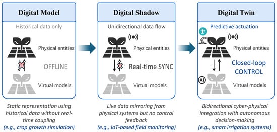 According to the prevailing taxonomy in digital twin research [12,13], integration levels have advanced sequentially from digital models (static) through digital shadows (dynamic) to full digital twins (interactive), with each stage defined by data coupling intensity and control capabilities. As shown in Figure 1. A Digital Model (DM) refers to a static, descriptive representation of a physical system, often used for visualization or structural understanding without automatic data updates from the real world. A Digital Shadow (DS) introduces a unidirectional data flow from the physical asset to the digital replica, enabling real-time monitoring and partial synchronization, but lacking full interactivity or bi-directional feedback. In contrast, a DT entails a dynamic, bidirectional communication loop where real-time data continuously updates the virtual model, and insights or simulations from the model can influence the physical system, enabling advanced prediction, control, and optimization processes. As emphasized by Kritzinger et al. [12], a digital shadow can be viewed as a necessary intermediate step toward a true digital twin, particularly in domains like agriculture where infrastructure constraints often limit full bi-directional integration. In this review, we adopt a pragmatic stance by referring to all stages—whether digital shadow or full digital twin—under the term “DT”.