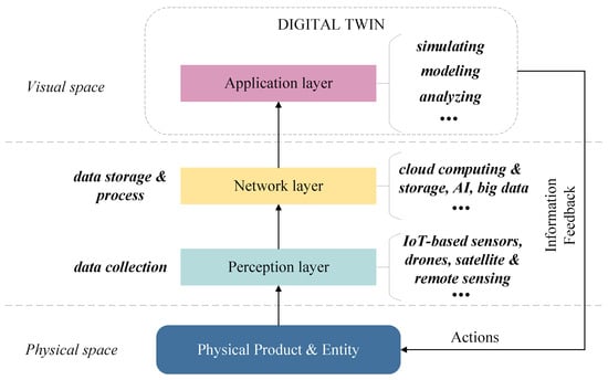 In Figure 3, the architecture is typically structured in three layers: the perception layer, the network layer, and the application layer. Each layer plays a distinct role in ensuring the accurate representation and functioning of the DT system [59].
