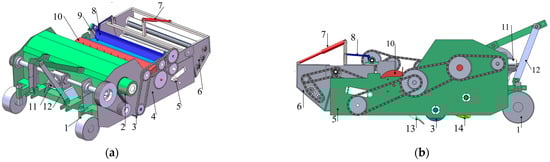 Overview of the structure and schematic diagram: (a) axonometric drawing of the complete machine structure; (b) front drawing of the complete machine structure. 1. Ground wheel; 2. screw conveyor; 3. roller; 4. frame; 5. film-lifting shovel penetration angle adjustment mechanism; 6. film-collecting box; 7. hydraulic cylinder; 8. auxiliary film-shifting mechanism; 9. film guide plate; 10. eccentric teeth shifting cylinder; 11. gearbox; 12. suspension frame; 13. film-lifting shovel; 14. stubble-cutting knife set.