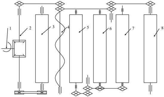 Schematic of the transmission system. 1. Power input shaft; 2. power output shaft; 3. crushing device; 4. screw conveyor; 5. pressing roller; 6. eccentric teeth shifting cylinder; 7. film-shifting device; 8. film-collecting device.