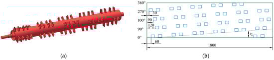 Schematic of the crushing knife shaft: (a) axonometric drawing of the crushing knife shaft; (b) unfolded drawing of the arrangement of the knife seat on the cutter.