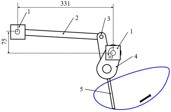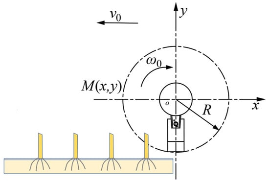 The absolute velocity at the tip of the moving knife is the resultant velocity of the machine’s forward speed and the linear velocity. The axis of the knife roller is the origin, and the negative X-axis is the forward direction. A Cartesian coordinate system is established, as shown in Figure 6. The equation of the trajectory of the point M (x, y) at the end of the moving blade is