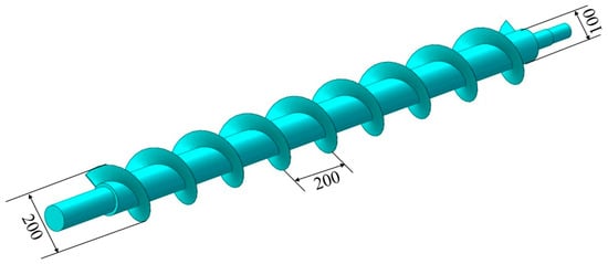 To sum up, the screw conveyor shaft diameter should be 100 mm, the screw blade diameter should be 200 mm, the screw angle should be 50°, and the screw pitch should be 200 mm. Figure 7 shows the structure.