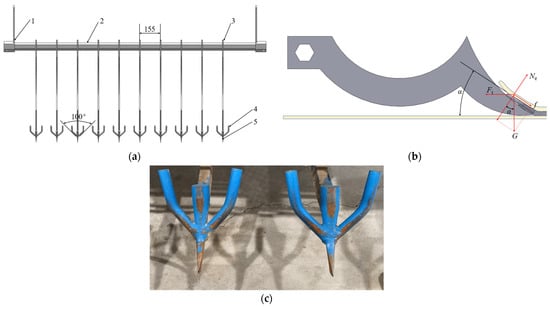 Film-lifting device: (a) structure of the film-lifting device; (b) force analysis of the film-lifting shovel; and (c) physical picture of the film shovel. 1. Film-lifting shovel soil penetration angle adjustment mechanism; 2. film-lifting frame; 3. film-lifting shovel unit; 4. double wings of the film-lifting shovel; 5. main blade of the film-lifting shovel.