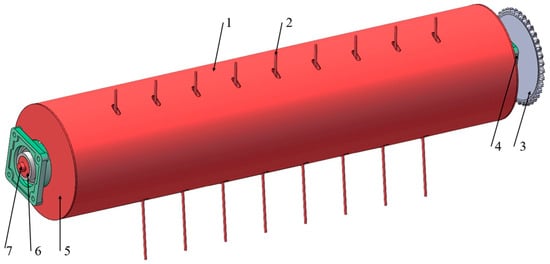 As shown in Figure 10, the film-lifting device uses an eccentric telescopic rod tooth cylinder to take the residual film and send it to the film-shifting device. The film-picking device mainly consists of a film-picking cylinder, telescopic rod teeth, an end cover, and other components. The end cover is connected to the film-picking cylinder through bolts. The driving shaft is hollow, with an outside diameter of 70 mm and an inside diameter of 42 mm. It is welded to the end cover, while the eccentric shaft is fixed to the frame and constitutes a shaft-in-axis structure with the driving shaft. The telescopic rod teeth are connected to the eccentric shaft through the rotary joint to lengthen and shorten along the long holes on the wall of the cylinder. The sprocket wheel is connected to the driving shaft through the key; the diameter of the drum is 380 mm, and there are three rows of telescopic rod teeth distributed uniformly in the circumferential direction. The telescopic rod teeth shafts are connected to the driving shaft by keys.