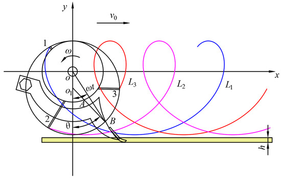 The axial distance is 155 mm between the three rows of telescopic rod teeth, uniformly distributed in the circumferential direction. In operation, the motion of the telescopic rod teeth is a combination of forward and rotational motion. The motion trajectories of the telescopic rod teeth 1, 2, and 3 in the circumferential direction are L1, L2, and L3, which are shaped as cycloids, as shown in Figure 11. The machine’s forward direction is the direction of the X-axis, with point o of the eccentric drum rotation axis as the origin. The Y direction extends vertically upward, the radius of the drum is R, the length of the telescopic rod teeth o1AB is L, the length of the crank oo1 is E, which is the length from the cylinder rotary center to the telescopic rod teeth rotary center, and the cylinder’s angular velocity is ω. After a period of time t, the telescopic rod teeth transition from the vertical position to the position of the o1AB, the intersection point of the telescopic rod teeth and the cylinder is A, and the angle of the cylinder is ωt. The equations of motion at points A and B are as follows: