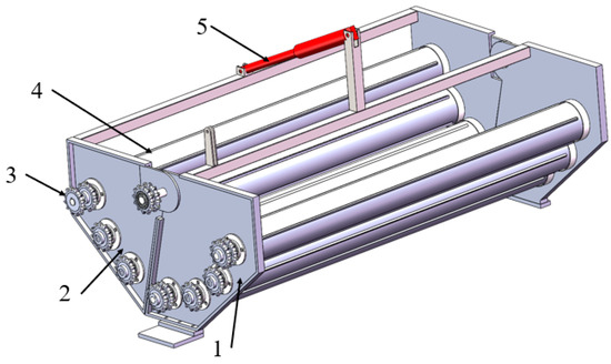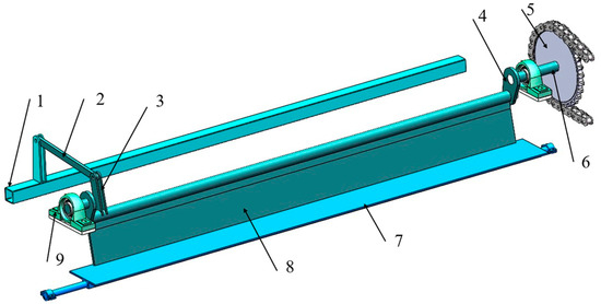 As shown in Figure 2, the combined operation machine consists of a suspension frame, straw-crushing device, lateral screw conveying device, film-lifting device, film-picking device, auxiliary film-shifting device, and film-collecting device. The corn straw-crushing and returning device crushes corn straw and returns it through a spiral arrangement of knives and an upper spiral conveyor, thereby shortening the longitudinal length of the machine for easier lifting. The film-lifting device is characterized by a double-wing, single-blade shovel with an adjustable angle. The film-picking device uses an eccentric teeth shifting cylinder, while the auxiliary film-shifting device uses a crank–rocker mechanism connected to a connecting rod, which enables it to complete the film-shifting process according to the expected motion trajectory. The film-collecting device consists of seven rotating rollers of equal diameters. The main parameters are listed in Table 2.