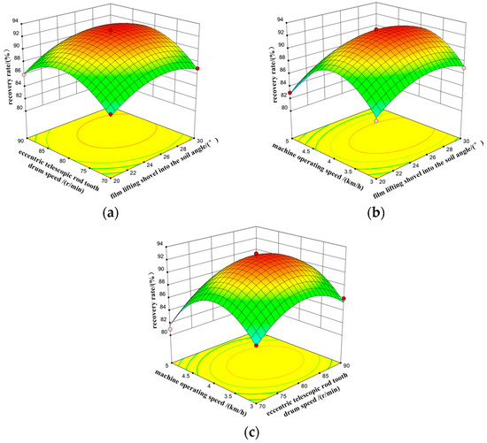 In this study, the Box–Behnken experimental design method was used. Compared to other methods, such as Taguchi and response surface methodology, Box–Behnken has a wide range of applications, requires fewer experiments, and is suitable for sampling the behavior of multi-parameter functions. Its structured yet flexible framework is ideal for optimizing complex processes in fields like chemistry, biotechnology, and environmental engineering. The effect of the test factors on residual film recovery is presented in Figure 19, where the darker the color of the response surface, the larger the value represented by the position. From Figure 19 and Table 5, the following order of significance of the test factors was obtained: Film-lifting shovel into the soil angle > the rotational speed of the eccentric teeth shifting cylinder > the machine operating speed, and interaction effects of the factors on the residual film recovery rate existed. From Figure 19a, when the machine operating speed was fixed at 4 km/h, the interaction between the film-lifting shovel into the soil angle and the rotational speed of the eccentric teeth shifting cylinder showed that as they increased, the rate of residual film recovery first increased and then decreased, which is due to the increase in the angle of film-lifting shovel into the soil and the decrease in the rate of missed residual films. The continued increase in the angle of the film-lifting shovel into the soil resulted in the stubble being shoveled up, leading to an increase in the clogging rate of the film. This is because the rate of missed residual films decreased when the angle of the film-lifting shovel into the soil increased. As can be seen from Figure 19b, when the eccentric teeth shifting cylinder rotation speed was 80 r/min, the angle of the film-lifting shovel into the soil and the machine operating speed interaction law showed that when they increased, the recovery rate of the residual film first increased and then reduced, and the forward direction of the magnitude of change increased. This is because of the increase in the operating speed of the machine, which makes it harder for stubble to be shoveled, thus weakening the phenomenon of clogging. As the operating speed increased, the rate of missed residual films increased; therefore, the angle of the film-lifting shovel into the soil and the operating speed of the machine should be controlled in a reasonable range. As shown in Figure 19c, when the angle of the film-lifting shovel into the soil was fixed at 25°, the interaction between the eccentric teeth shifting cylinder speed and the speed of machine operating showed that when they increased, the rate of residual film recovery increased and then decreased, and the rate of residual film recovery was the largest when the ratio of the rotation speed of the eccentric teeth shifting cylinder and the operating speed of the machine was 1.4.