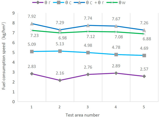 Based on GB/T 24643-2009 (Fuel consumption of tractor set during field operation—Test methods) [43], the fuel tank was filled up before the experiment, the operating area after the whole machine started working was recorded, and then the fuel tank was filled up again after the experiment had been completed. The weight of the added fuel was recorded, which reflects the weight of the consumed fuel. Power consumption was measured in terms of fuel consumption speed. The calculation formula is as follows: