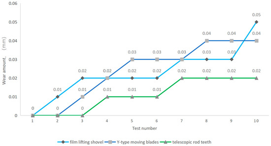 On this machine, the film-lifting shovel, Y-type moving blades, and telescopic rod teeth wear relatively easily. To track their wear, the machine worked continuously for 10 days, 7 h a day, measuring the wear and deformation five times. The average value was then taken, and the test results are shown in Figure 21.