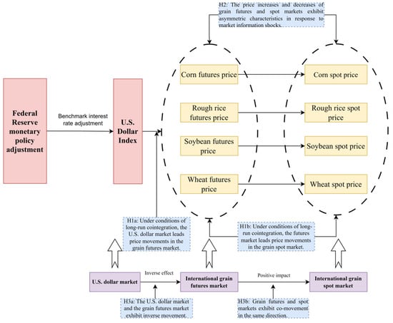 Hypothesis H1. Under conditions of long-run cointegration, the U.S. dollar index influences international grain futures market prices, while grain futures market prices influence spot market prices.
