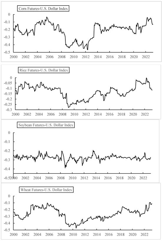 Figure 4, the correlation coefficients between the U.S. dollar index and the four types of grain futures remain stable in the range of −0.45 to −0.15, indicating a negative short-term correlation between the dollar index and grain futures prices, and thus supporting Hypothesis H3a. More dramatic changes in the correlation coefficients of the four grain futures can be observed, particularly during periods when the Federal Reserve cuts interest rates, the U.S. dollar index declines, and international food prices rise, thereby further validating the asymmetric nature of volatility in international food prices. Specifically, under adjustments in Federal Reserve interest rates, a strengthening dollar index leads to a decline in the futures prices of the four grain categories, whereas a weakening dollar index causes these prices to rise, thereby confirming Hypothesis H3a.