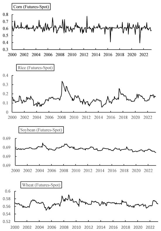 process). Therefore, the logarithmic values of corn (futures–spot), rice (futures–spot), soybean (futures–spot), wheat (futures–spot) and the U.S. dollar index are all time series (