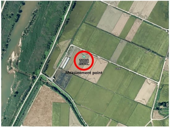 The measurement site was selected as a partial paddy farming area located in Yeoju City, Gyeonggi-do, South Korea, which complies with the Ministry of Environment’s guidelines for the installation and operation of air pollution measurement networks and fulfils the conditions for the monitoring data to consider only the effects of agricultural activities and exclude the effects of other external factors. As shown in Figure 1, the site is a typical paddy farming area consisting only of large paddy fields with no industrial complexes and small towns within 5 km, except for a small village at a distance of about 1000 m to the north of the measurement point.