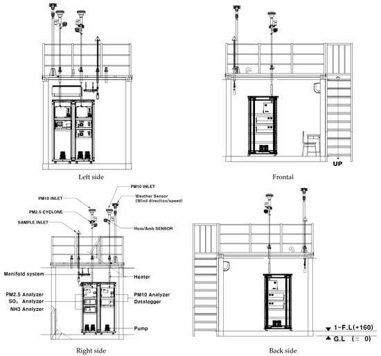 As shown in Figure 2, the air quality station is built in the form of a container measuring 2.5 m by 3 m. At the top of the container is the intake for particulate pollutants. A handrail is installed at the top of the station for safety while working, and the sides are equipped with stairs for easy access to the roof. The measuring equipment is installed inside the room, and the temperature is maintained by a heating and cooling system. The entrance door is equipped with a door lock, and CCTV and fans are installed to enhance security (Figure 3).