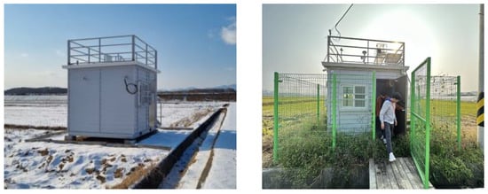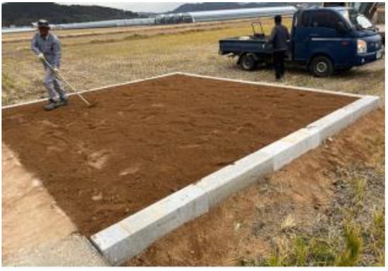When installing measuring stations in actual areas where agricultural activities are carried out, groundworks are essential, as subsidence and tilting can occur, and there is a risk of flooding during rainfall. Groundworks were carried out for each installation point in each region, taking into account the installation environment. Due to the size of the container and the installation of the pans, work was done to secure an area of 5 m × 5 m and a minimum height to prevent flooding (Figure 4).