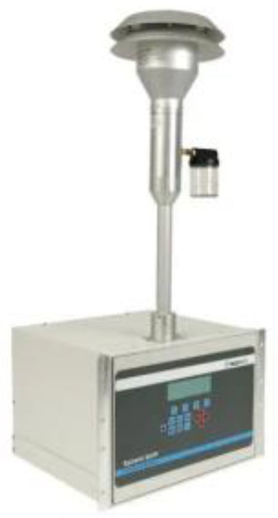 The measurement of particulate matter was performed using a particulate matter measuring instrument called Spirant BAM (Model 3, Kentech Corp., Daejon, Republic of Korea) to monitor PM10 and PM2.5 in the air in real time (hourly intervals). Two Spirant BAMs were installed at this site, each equipped with an inertial particle size separator (very sharp cut cyclone; VSCC). The Spirant BAM is a standard instrument, approved by the Korean Ministry of Environment, that measures the concentration of fine particulate matter using beta radiation by measuring the amount of particles collected on filter paper (Figure 5). Its accuracy exceeds U.S. EPA Class 3 PM2.5 and PM10-2.5 FEM standards for additive and multiplicative bias, and resolution is 1 μg/m3.